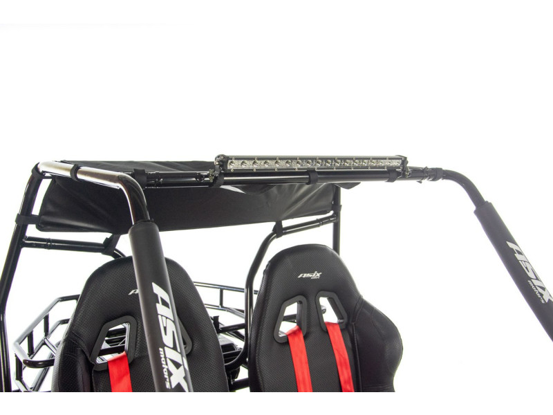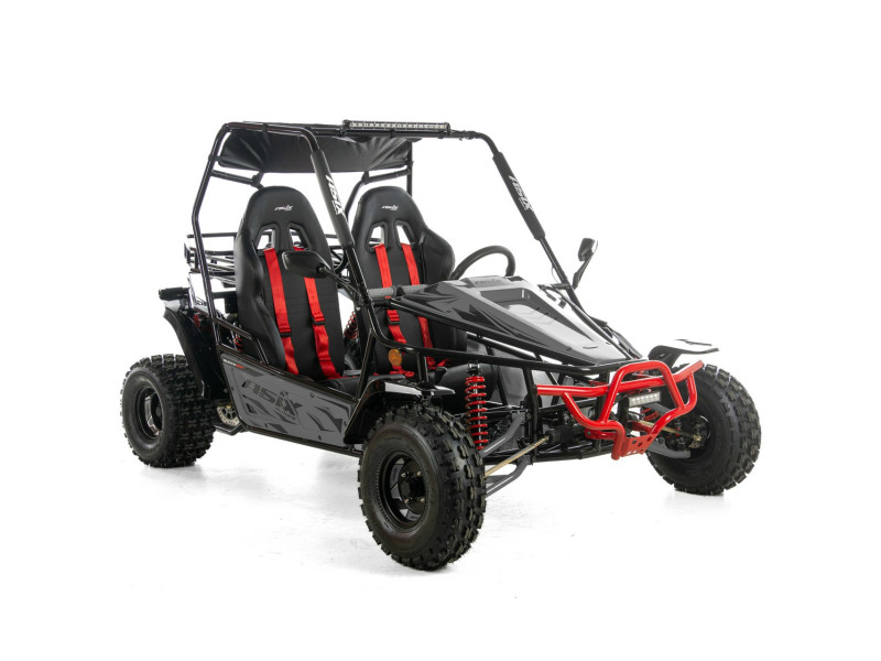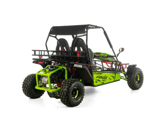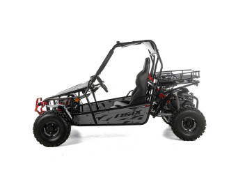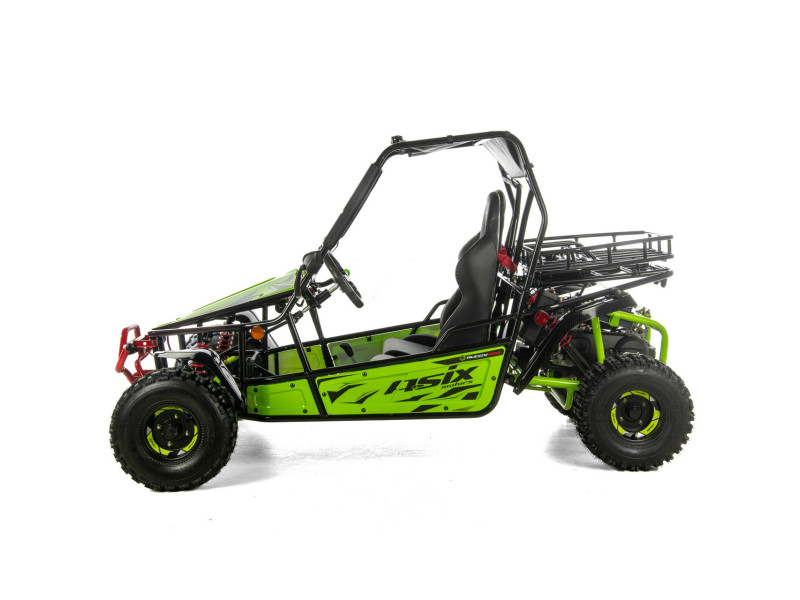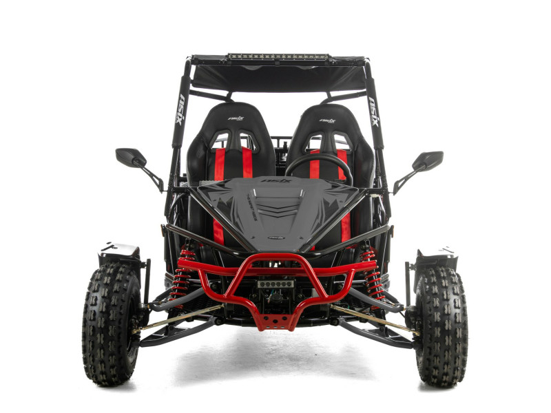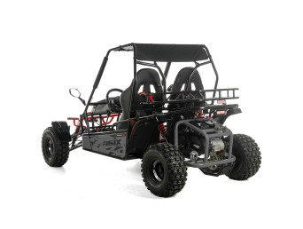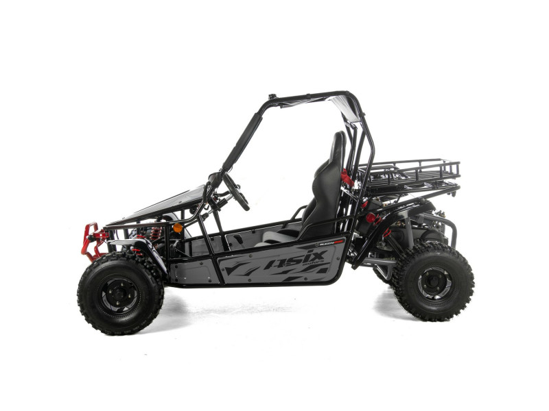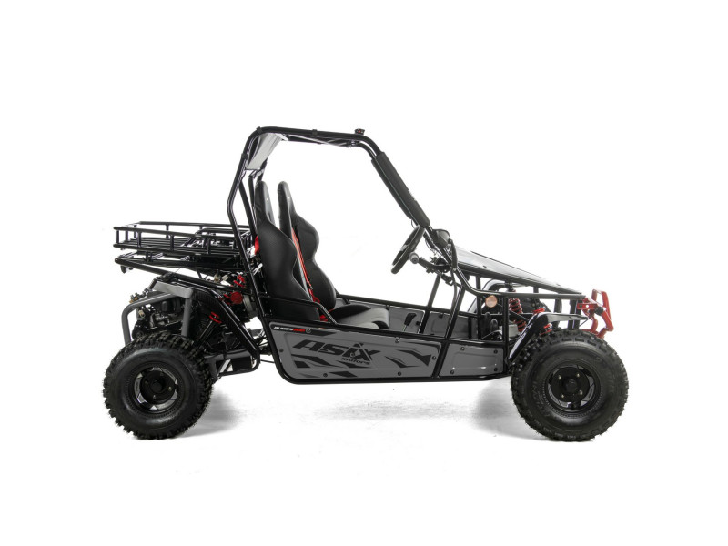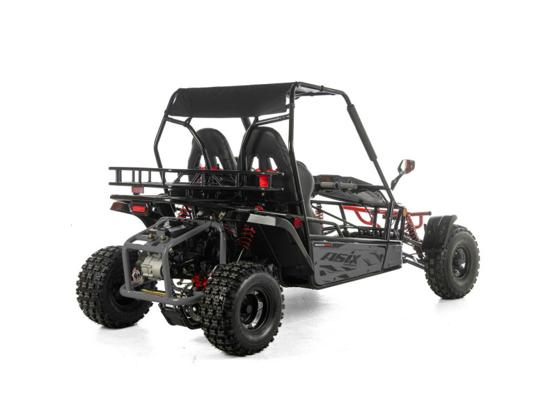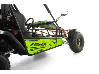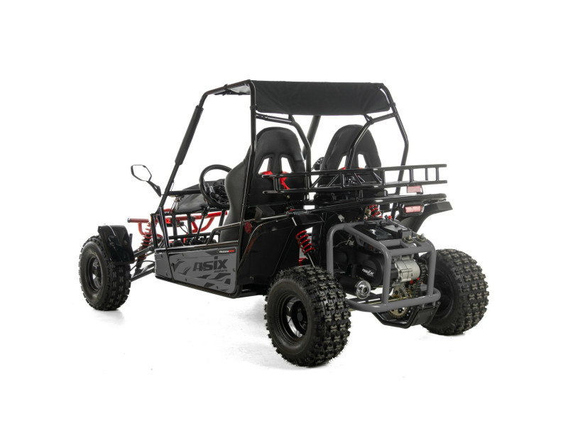 ASIX Buggy 200 został zbudowany na solidnej, stalowej ramie, która zapewnia stabilność konstrukcji, wysoką odporność na obciążenia oraz trwałość. Buggy wyposażono w terenowe opony i zawieszenie terenowe, które dobrze tłumi nierówności i zwiększa komfort jazdy nawet na trudniejszych trasach.