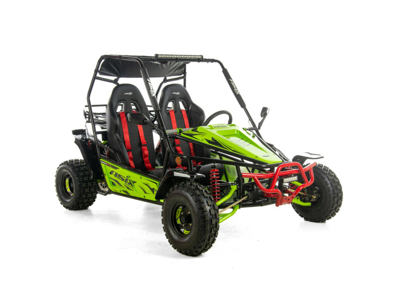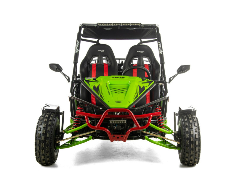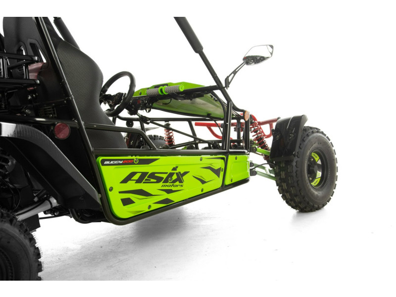 Napęd ASIX Buggy 200 oparty jest na czterosuwowym silniku o pojemności ok. 200 cm³, chłodzonym powietrzem. Jednostka jest dynamiczna i przewidywalna, co przekłada się na płynne przyspieszenie i stabilną moc — idealną do jazdy rekreacyjnej, terenowej zabawy oraz spacerów z pasażerem.
