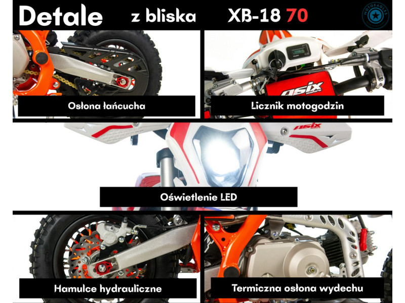 ASIX XB-18 napędzany jest czterosuwowym silnikiem o pojemności 70 cm³, chłodzonym powietrzem. Silnik oferuje łagodną moc i płynną pracę, co zapewnia bezpieczną oraz przewidywalną jazdę, nawet dla mniej doświadczonych użytkowników.