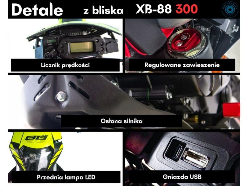 ASIX XB-88 300 to mocny, pełnowymiarowy motocykl crossowy o pojemności 300 cm³, stworzony dla riderów, którzy oczekują maksymalnej mocy, stabilności i wyraźnego zapasu momentu obrotowego w terenie. To propozycja dla osób jeżdżących regularnie off-road i szukających sprzętu, który radzi sobie w trudniejszych warunkach – piach, koleiny, strome podjazdy i nierówne trasy.