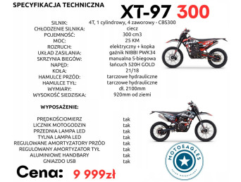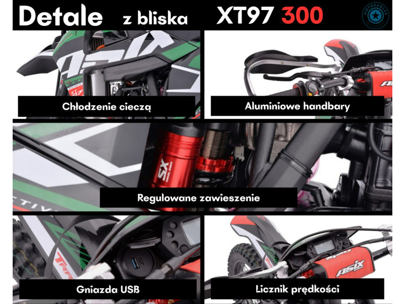 ASIX XT-97 300 to motocykl, który oferuje świetne osiągi terenowe, sportową charakterystykę i solidne wyposażenie — idealny wybór dla entuzjastów off-roadu i motocross/enduro.