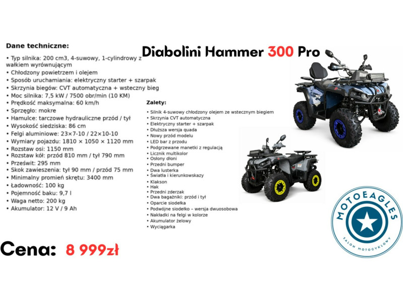 Diabolini Hammer 300 Pro to quad terenowy oferujący prostą obsługę, stabilną konstrukcję oraz praktyczne wyposażenie. Dzięki automatycznej skrzyni biegów i szerokiej konstrukcji jest łatwy w prowadzeniu i dobrze sprawdzi się podczas rekreacyjnej jazdy w terenie.