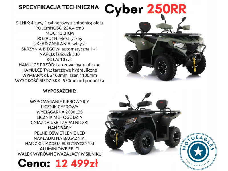 ASIX Cyber 250RR to quad, który daje dużo frajdy z jazdy, świetnie sprawdza się zarówno w terenie, jak i na drodze — gotowy do jazdy od pierwszych metrów.