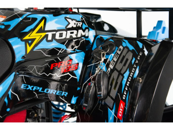 XTR Storm Pro 125 został zbudowany na solidnej ramie stalowej, która zapewnia odpowiednią sztywność i stabilność podczas jazdy w terenie. Quad porusza się na terenowych oponach o wyraźnym bieżniku, gwarantujących dobrą przyczepność na różnych nawierzchniach.
