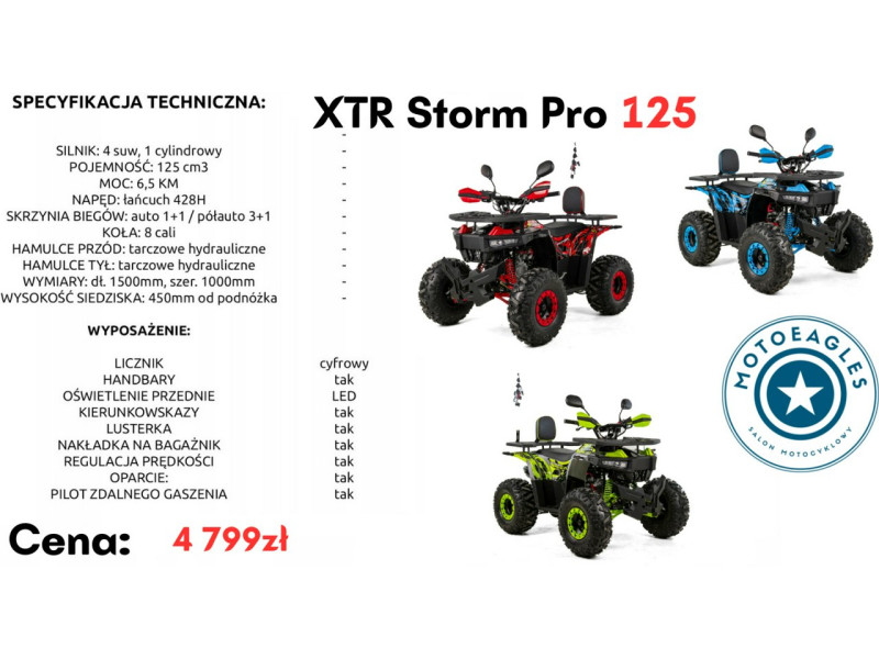 XTR Storm Pro 125 to quad, który oferuje bezpieczną, stabilną i przyjemną jazdę w terenie, z możliwością wyboru skrzyni biegów dopasowanej do Twoich potrzeb.